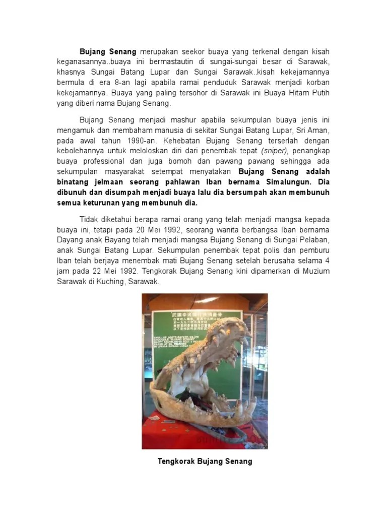Buaya bernama bujang senang itu di masa lalu pernah digosipkan sebesar bus, bisa makan pria dewasa dalam satu gigitan. ٢٠ ذو الحجة ١٤٤١ هـ. Bujang senang berjaya ditembak mati pada 22 mei 1992 namun nama buaya ini . Segelintir penduduk iban di sarawak percaya bahawa legenda buaya raksasa 'bujang senang' yang mengganas di sungai batang lupar, . Bujang senang berjaya ditembak mati pada 22 mei 1992 namun nama buaya ini masih disebut sehingga ke hari ini.